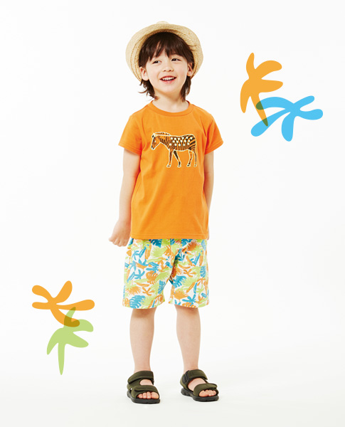 [BOY] Hat ¥2,900+tax / Rash guard ¥2,900+tax / Surf pants ¥2,900+tax / Pool bag ¥3,300+tax / Sandals ¥3,900+tax